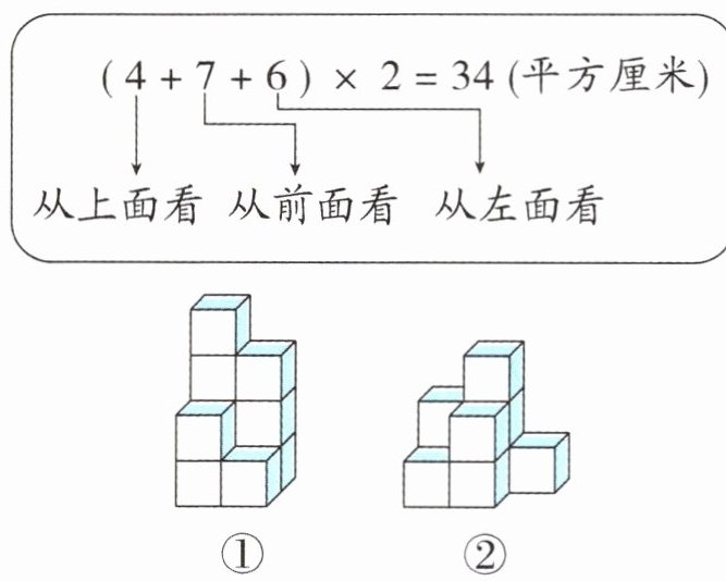 (5+6+5)×2=32(平方厘米) 提示:根据题图①的观察方法进行解答,题图②从前面看到6个面,同理,前面的对面也有6个面,右面和左面各有5个面,上面和下面各有5个面,一个正方体的一个正方形面的面积是1×1=1(平方厘米),所以列式为(5+6+5)×2=32(平方厘米)。