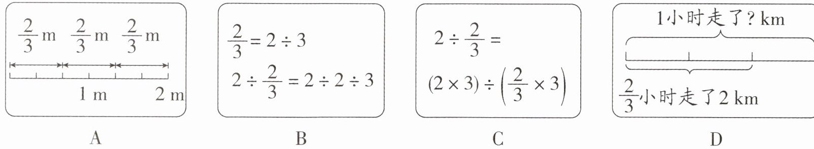 B 提示:A 选项,从题图中可以看出,2 米里面有 3 个$\frac {2}{3}$米,求一个数里面有几个另一个数,用除法计算,列式为$2÷\frac {2}{3}$,所以 A 选项合理;B 选项,$\frac {2}{3}$可以看成$2÷3$,而$2÷\frac {2}{3}=2÷(2÷3)$,要先算括号里面的运算,所以 B 选项不合理;C 选项,根据商不变的规律可知,被除数和除数同时乘或除以同一个不为 0 的数,商不变,所以$2÷\frac {2}{3}=(2×3)÷(\frac {2}{3}×3)$,C 选项合理;D 选项,已知$\frac {2}{3}$小时走了 2 千米,根据“速度=路程÷时间”,要求 1 千米走的路程,用$2÷\frac {2}{3}$,D 选项合理,所以想法不合理的只有 B 选项。