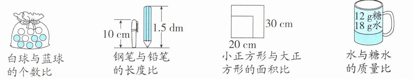 B 提示:第一幅题图,白球有 4 个,蓝球有6 个,白球与蓝球的个数比是$4:6=(4÷2):(6÷2)=2:3$;第二幅题图,1.5 分米=15 厘米,钢笔与铅笔的长度比是$10:15=(10÷5):(15÷5)=2:3$;第 3 幅题图,小正方形的面积=$20×20=400$(平方厘米),大正方形的面积=$30×30=900$(平方厘米),小正方形面积:大正方形面积=$400:900=(400÷100):(900÷100)=4:9$;第四幅题图,水是 18 克,糖是 12 克,则糖水是$12+18=30$(克),水与糖水的质量比是$18:30=(18÷6):(30÷6)=3:5$,能用$2:3$表示的只有 2 个,所以此题的正确选项是 B。