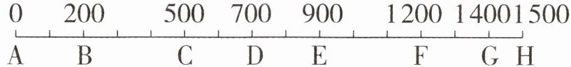 (2)因为火车票价=全程参考价×$\frac {实际乘车里程数}{总里程数}$,代入数据可以求出实际乘车里程数,用 B 站对应的里程数,加上实际乘车的里程数,就是到站对应的里程数,即可看出是到哪一站下车,设实际里程数为 x 千米,即$70=150×\frac {x}{1500}$,即$70=0.1x,x=70÷0.1=700$(千米),$200+700=900$(千米),900 千米对应的是 E 站,所以张阿姨的目的地是 E 站。