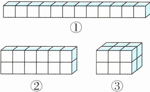 体积相等,表面积不相等。因为三幅题图中小正方体的数量相等且小正方体完全相同,所以体积相等。假设小正方体的棱长都是1,题图①的表面积是50,题图②的表面积是40,题图③的表面积是32,所以表面积不相等。