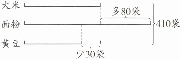 大米:$(410-80+30)÷3=120$(袋)面粉:$120+80=200$(袋) 黄豆:$120-30=90$(袋)答:大米有 120 袋,面粉有 200 袋,黄豆有 90 袋。
