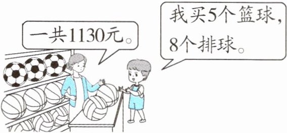 (1130+18×8)÷(8+5)=98(元) 98-18=80(元) 答:篮球的单价为98 元,排球的单价为 80 元。