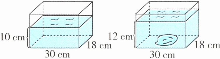 5.如图,一个长方体透明玻璃鱼缸,长30厘米,宽18厘米,水深10厘米。欣欣把一块石头浸入(完全浸没)水中后,水深为12厘米。这块石头的体积是多少立方厘米?