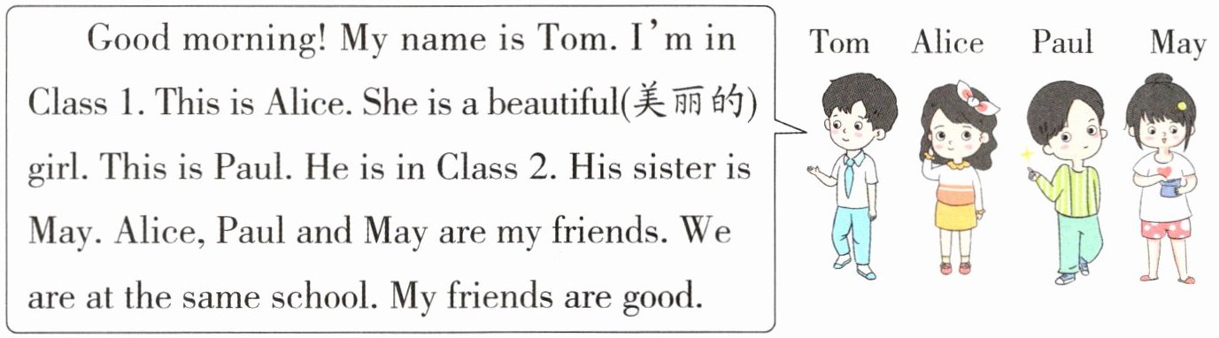 Good morning! My name is Tom. I’m in Class 1. This is Alice. She is a beautiful(美丽的)girl. This is Paul. He is in Class 2. His sister is May. Alice, Paul and May are my friends. We are at the same school. My friends are good.