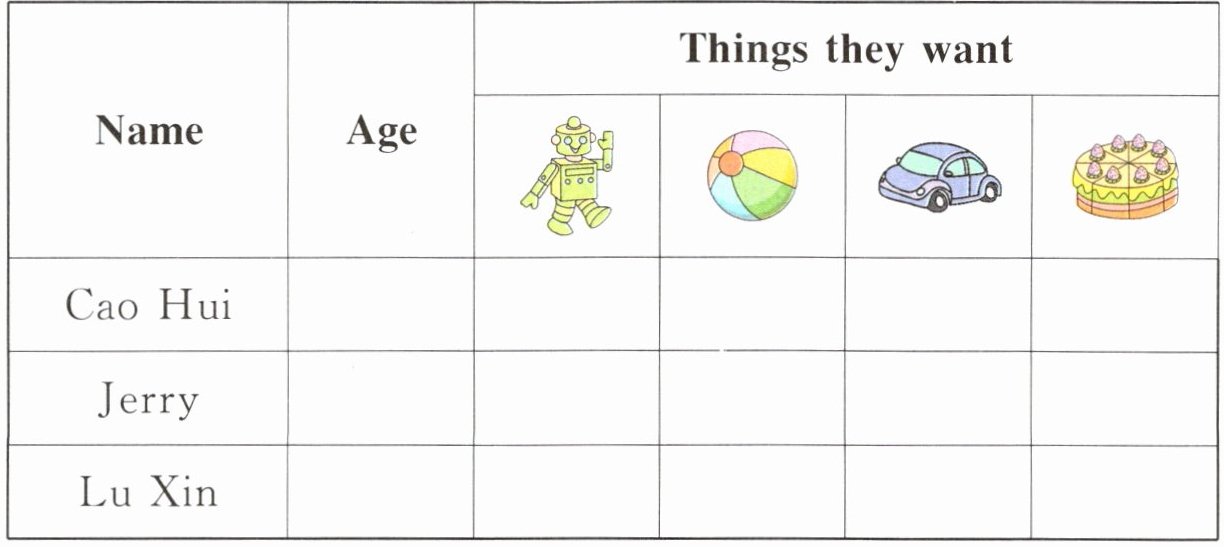 四 听录音,根据所听内容,用数字写出每个人的年龄,并在表格对应物品位置画“√”。(听两遍)