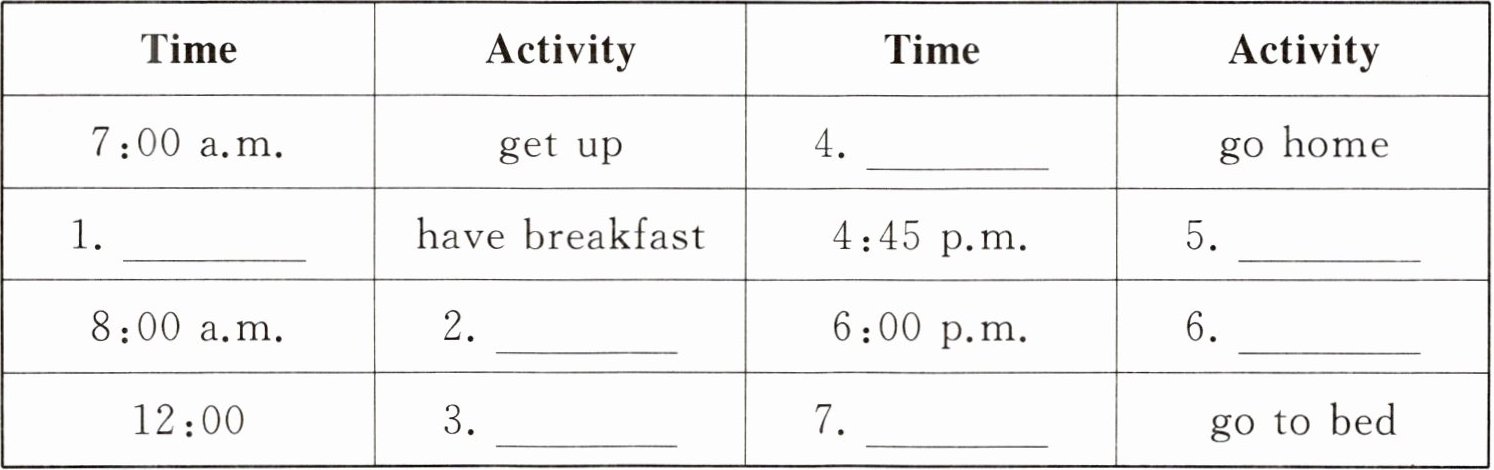 任务一:1. 7:30 a.m. 2. go to school 3. have lunch 4. 4:15 p.m. 5. do homework 6. have dinner 7. 9:30 p.m.