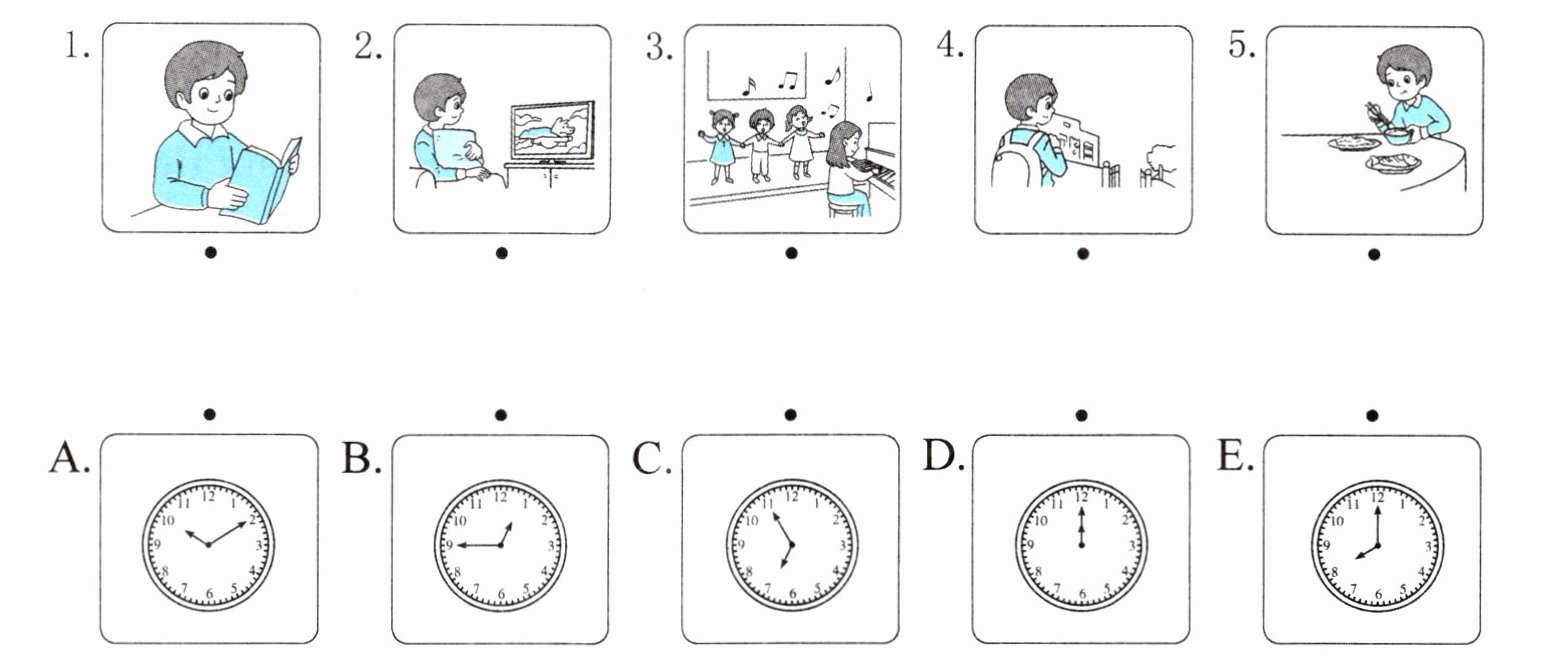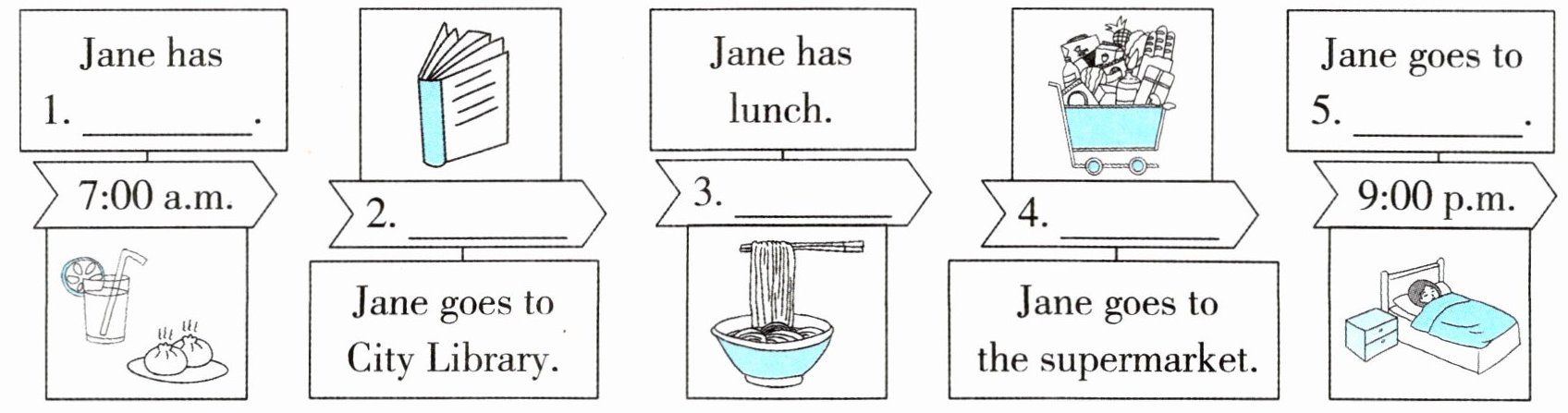 1. breakfast 2. 9:30 a.m. 3. 11:40 a.m. 4. 5:20 p.m. 5. bed