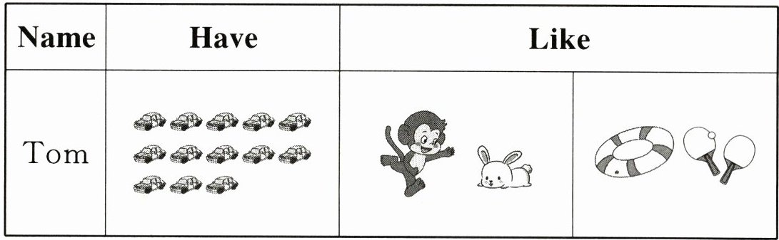 Hello, I'm Tom. I have thirteen toy cars. I like monkeys and rabbits. I like swimming. I also like playing ping-pong. I can play it very well. It's Friday today. I have a swimming lesson after school.