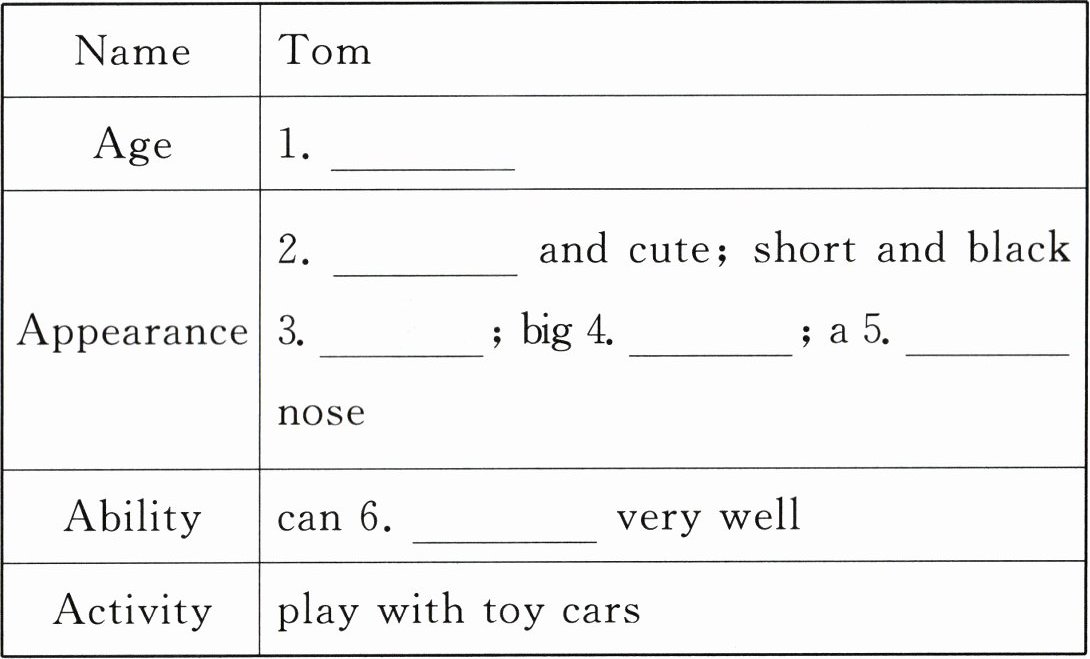 | Appearance | 2. ______ and cute;short and black 3. ______;big 4. ______;a 5. ______ nose |