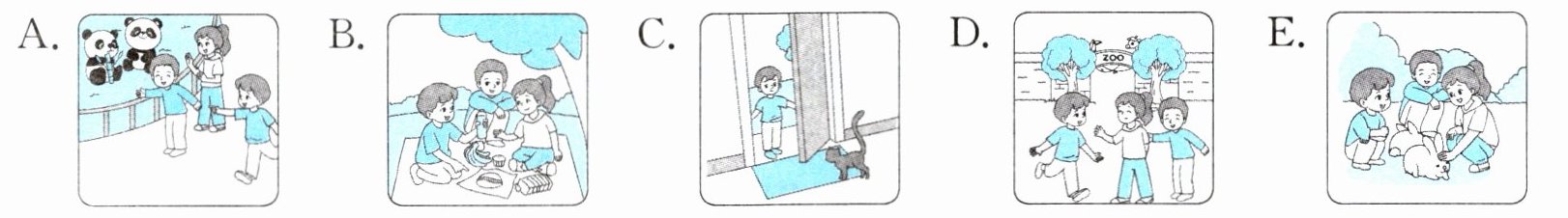 (五)周日,乔乔和朋友们去动物园亲近自然。读句子,选择对应的图片。