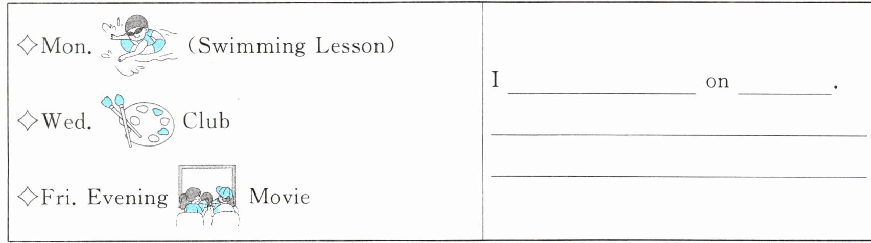 I have a swimming lesson on Monday. I go to the Art Club on Wednesday. I go to the cinema on Friday evening.