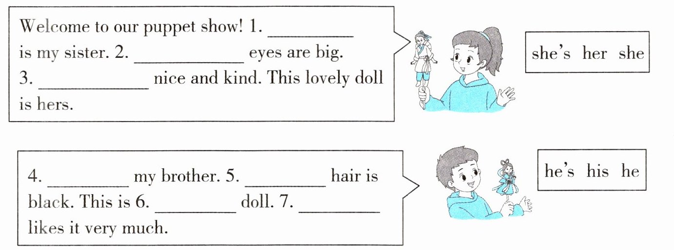 四 新素养 生活运用 Mia 在介绍自己的玩偶。根据所给图片,补全介绍内容。