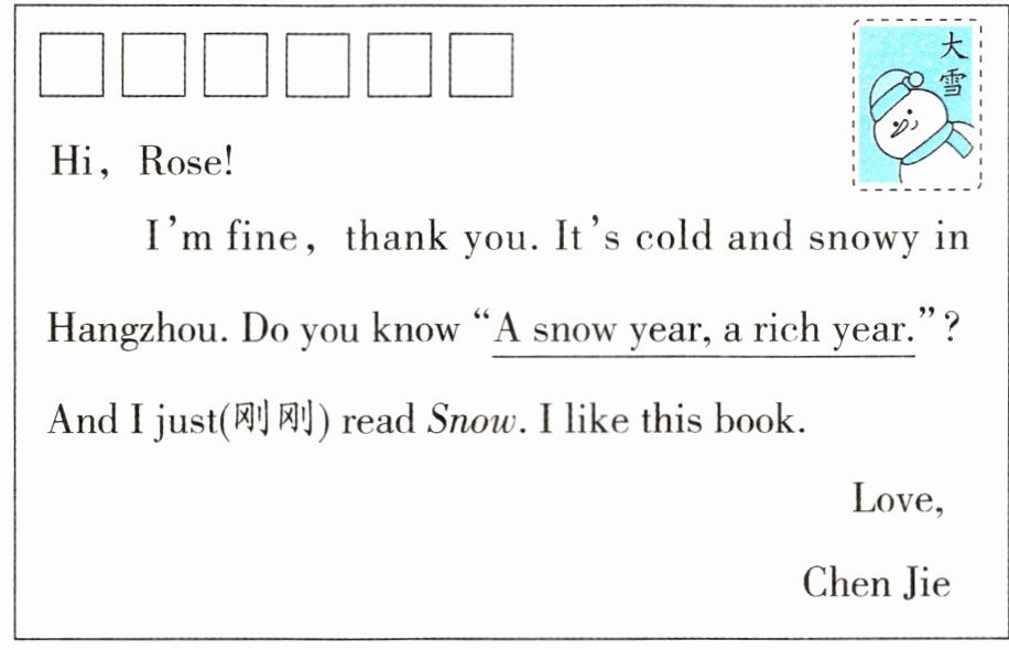二 新考法 学科融合 Chen Jie 给网友 Rose 寄了一张明信片。读一读,完成各题。