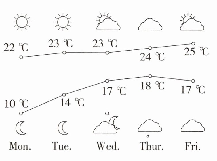 一 新考法 图示理解 观察周一至周五的天气预报,判断句子正(T)误(F)。