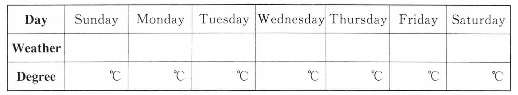 | Weather | sunny | cloudy | rainy | windy | sunny | cloudy | sunny |