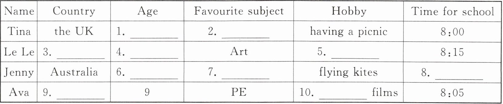 | Name | Country | Age | Favourite subject | Hobby | Time for school |