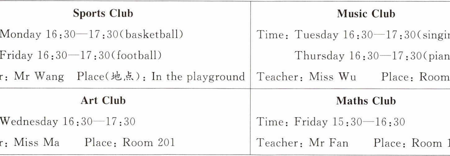 | Teacher: Mr Wang Place(地点): In the playground | Teacher: Miss Wu Place: Room 301 |