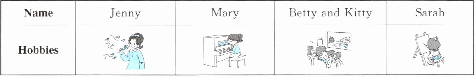 I have some f______. They have many different h______. Jenny likes ______. She can ______ lots of English songs. Mary likes ______ ______ ______. She always plays it after school. Betty and Kitty ______ like ______ ______. They always ______ ______ in the cinema. Sarah does well in ______. She ______ a lot of pictures in the park.