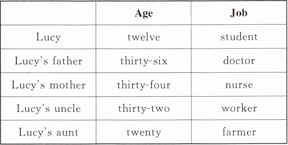 Hi,I'm Lucy. I'm ______ years old. I'm a ______. My father is ______. He is a ______. My mother is ______. She is a ______. She has long hair. They are in the same hospital. My uncle is a ______. How old is he? Can you guess? Oh,he is ______. And my aunt is ______. She is a ______. She works on a farm.