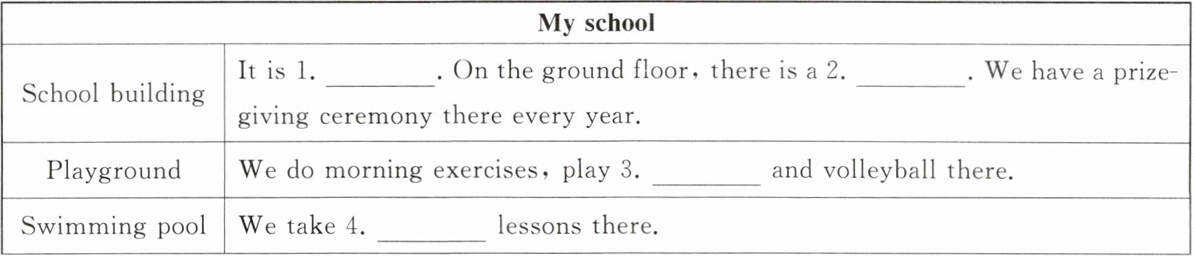 | School building | It is 1.______. On the ground floor, there is a 2.______. We have a prize-giving ceremony there every year. |