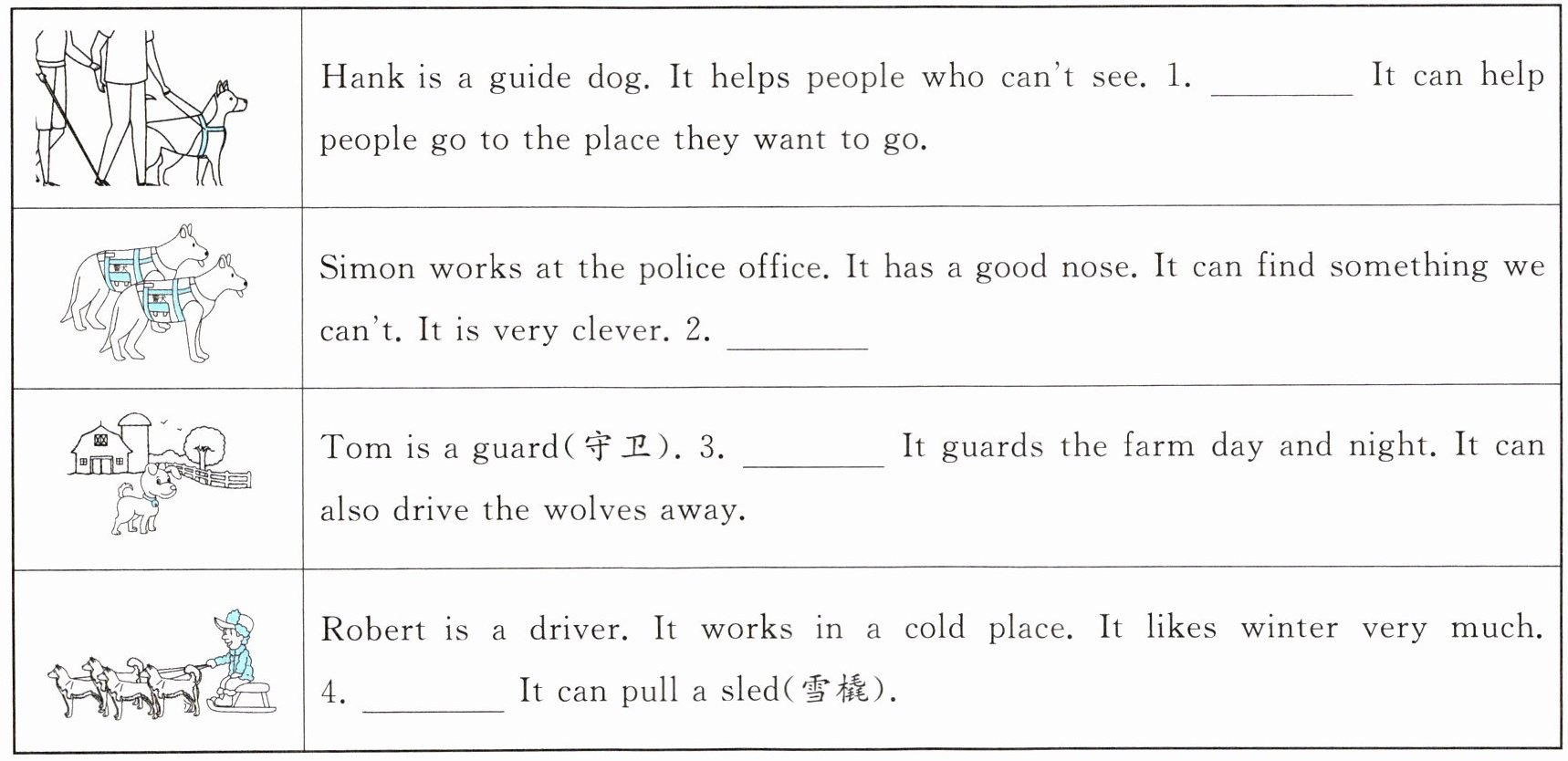 | | Robert is a driver. It works in a cold place. It likes winter very much. 4. ______ It can pull a sled(雪橇). |
