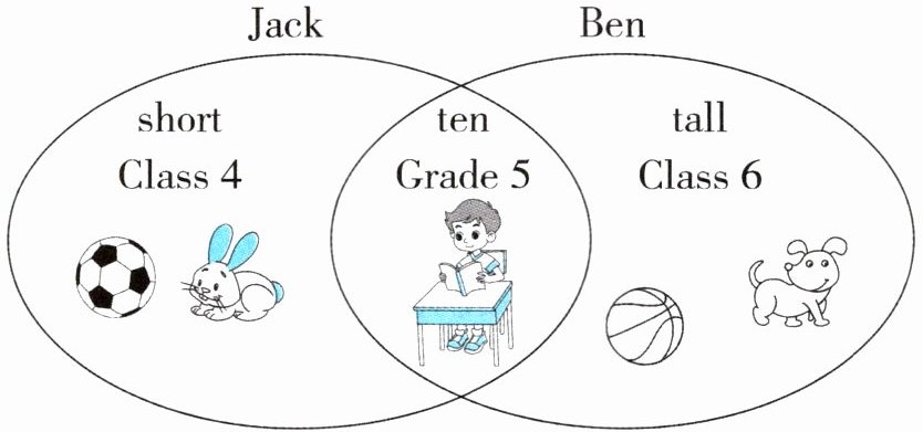 七 新语篇 统计图表 Ben 根据他和好朋友 Jack 的异同,绘制了韦恩图,请认真观察图片,判断下列句子正(T)误(F)。