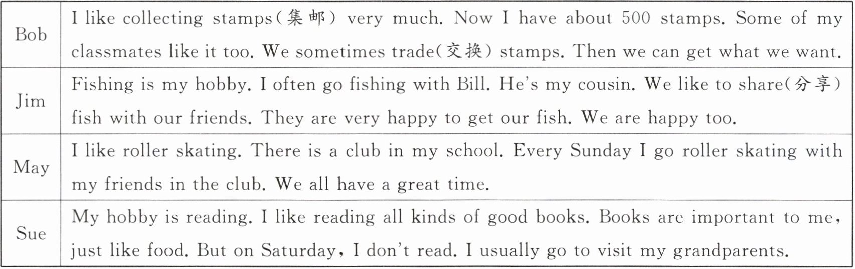 | Sue | My hobby is reading. I like reading all kinds of good books. Books are important to me,just like food. But on Saturday,I don't read. I usually go to visit my grandparents. |