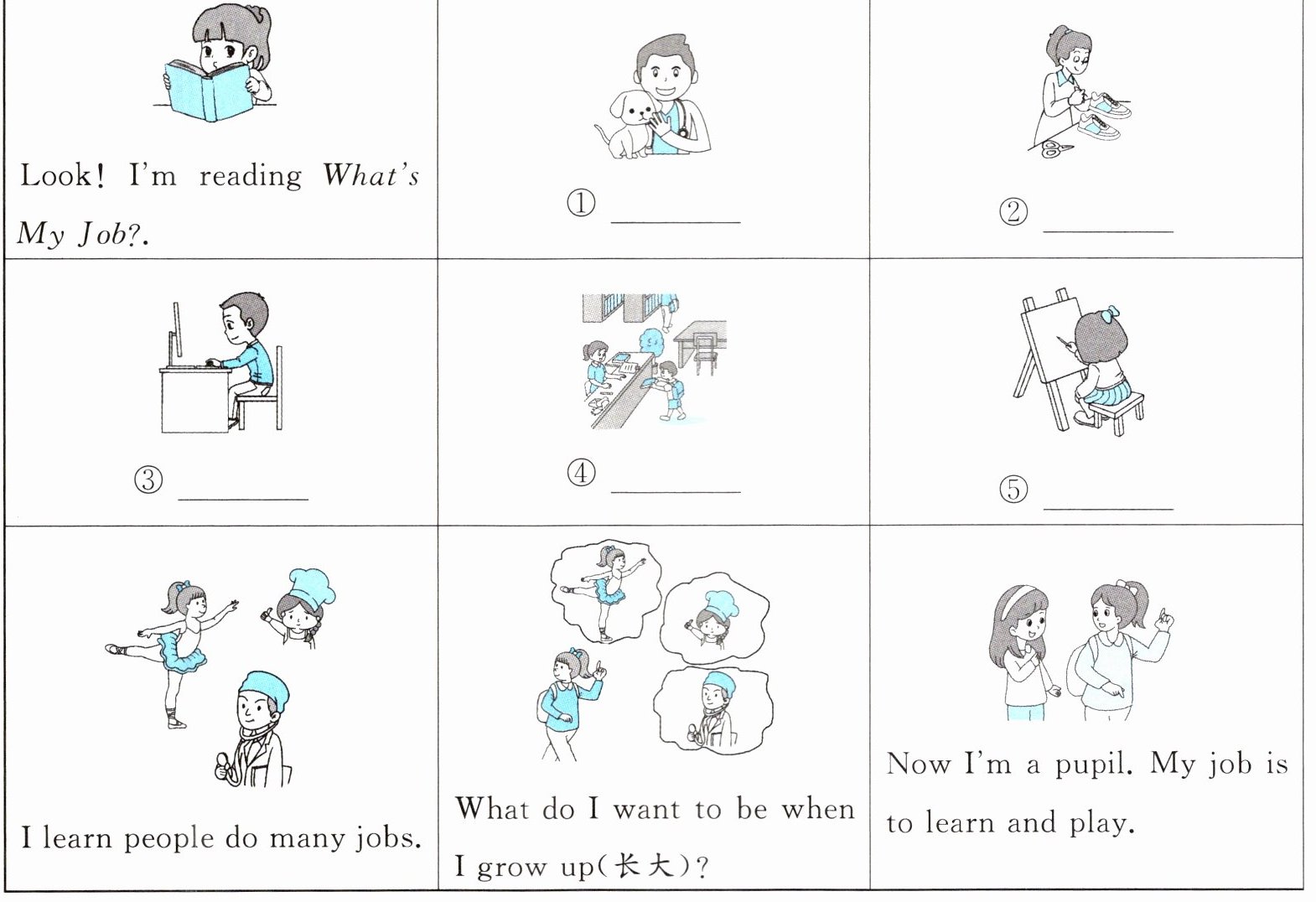 | I learn people do many jobs. | What do I want to be when I grow up(长大)? | Now I'm a pupil. My job is to learn and play. |