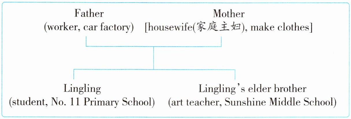 Look! This is Lingling's family tree. There are 1. ______ people in her family. Lingling is a 2. ______. She studies in No. 11 Primary School. And her elder brother is 3. ______ 4. ______ 5. ______. He 6. ______ art in Sunshine Middle School. Their father is a 7. ______ and he works in a car 8. ______. Their mother is a 9. ______. She likes 10. ______ clothes for them.