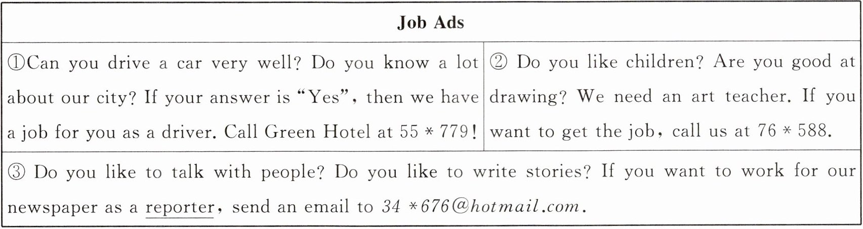 | ①Can you drive a car very well? Do you know a lot about our city? If your answer is "Yes", then we have a job for you as a driver. Call Green Hotel at 55※779! | ② Do you like children? Are you good at drawing? We need an art teacher. If you want to get the job,call us at 76※588. |
