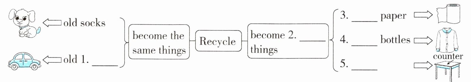 Yang Ling:Sometimes the things we recycle become the same(相同的)things. We can use the old socks to make toy dogs. We can also use old boxes to make toy cars.
