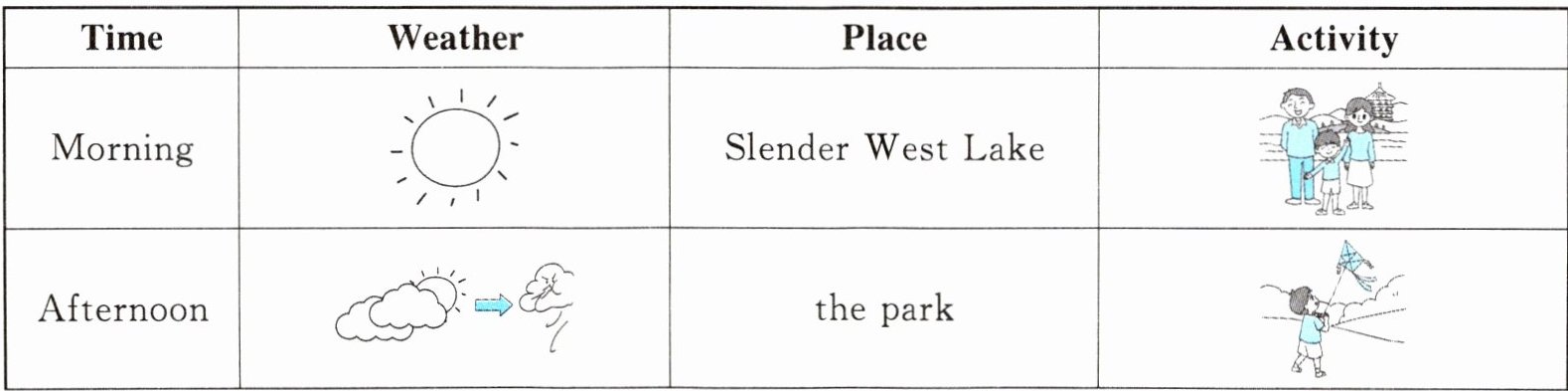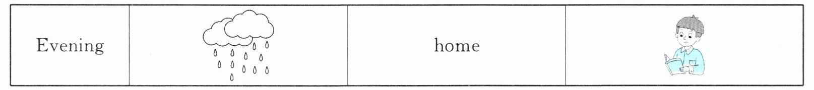 1. rainy;umbrella;wet 2. sunny;played basketball;playground 3. windy;flew kites 4. cloudy;saw;film;cinema