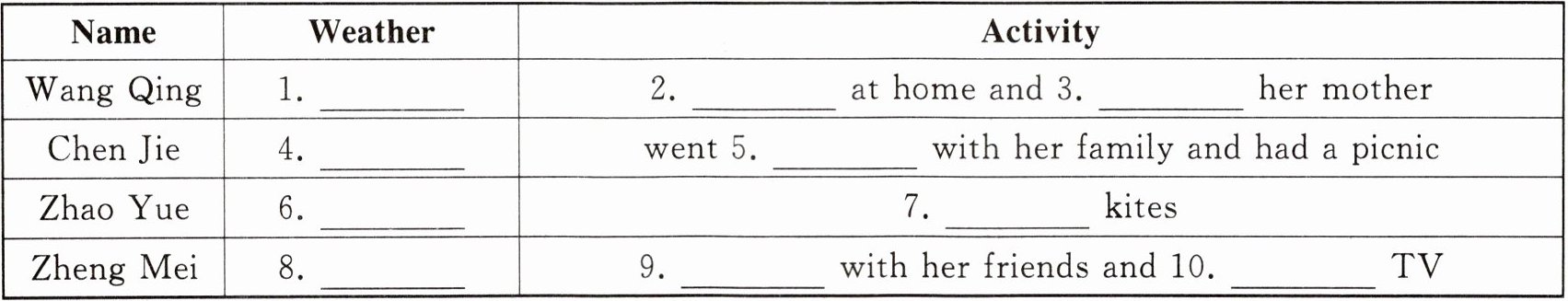 五 听录音,根据所听内容补全表格。(每空一词)(听三遍)