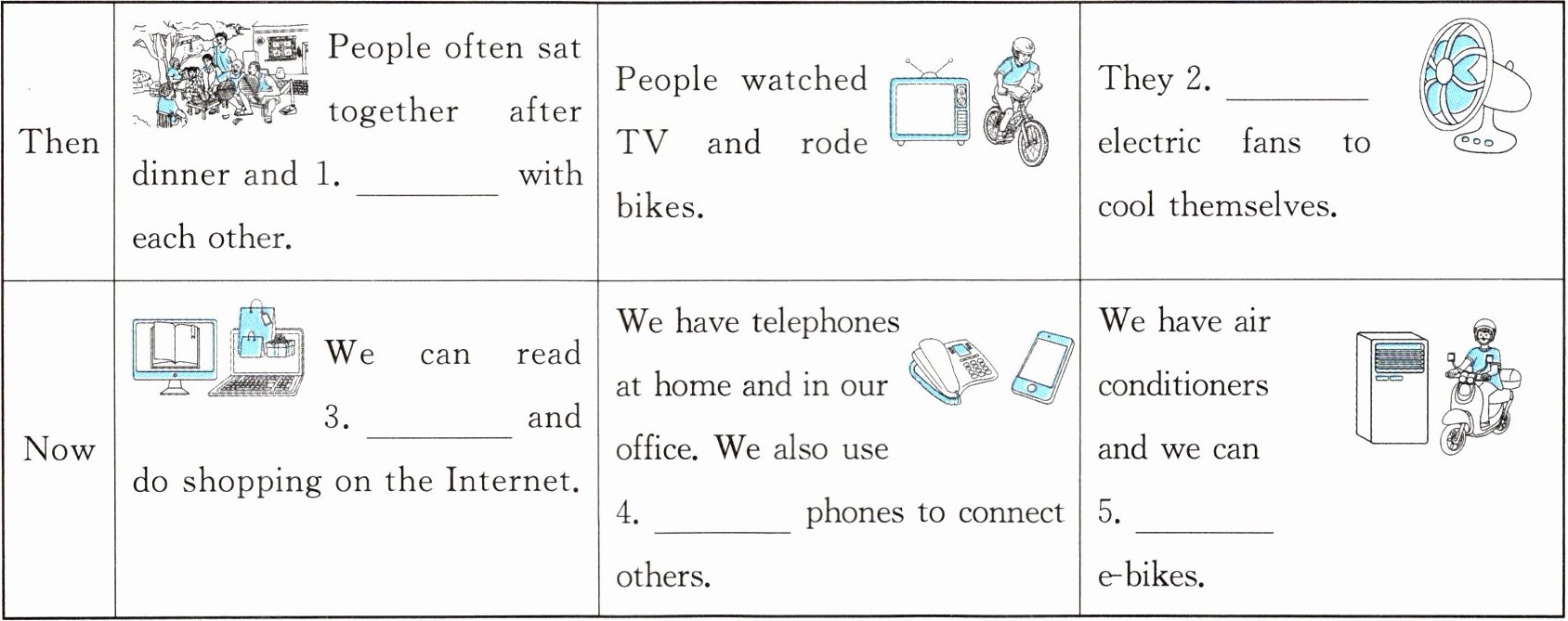 Every day we can find changes around us. Our life changed a lot these years. In the past, people often sat together after dinner and chatted with each other. But now, we have telephones at home and in our office. We also use mobile phones to connect others. Over ten years ago, people watched TV in their free time. But now we read e-books and do shopping on the Internet. People always rode bikes when they went out in the past. Now, we can ride e-bikes. It's convenient. In the past, people used electric fans to cool themselves when they felt hot. But now we can use air conditioners to cool ourselves. I like these changes!