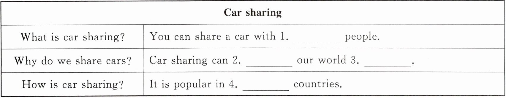 Now the idea of "car sharing(共享)" is popular in many countries. You can use a car but don't need to own(拥有) it. You can share a car with other people. Car sharing can make our world greener.