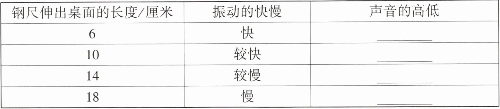3. 下面是某兴趣小组研究钢尺伸出桌面的长度与音高的变化记录表,填表并根据记录表解决问题。
