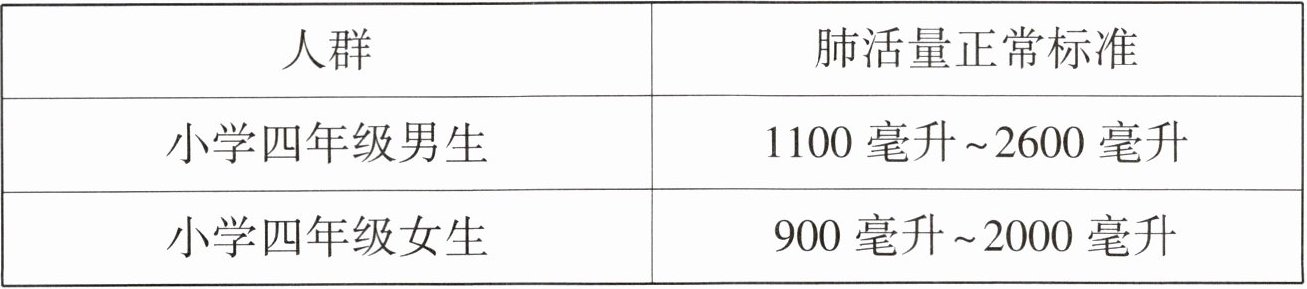 (4)在一次体质测试中,四年级的男生小科肺活量为2200毫升。参照《国家学生体质健康标准(2014年修订)》中有关肺活量的数据,他的肺活量( )。