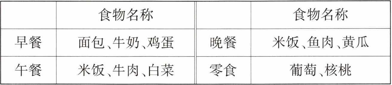3. 下表是小科统计的自己一天中吃的食物,请你根据表格回答问题。