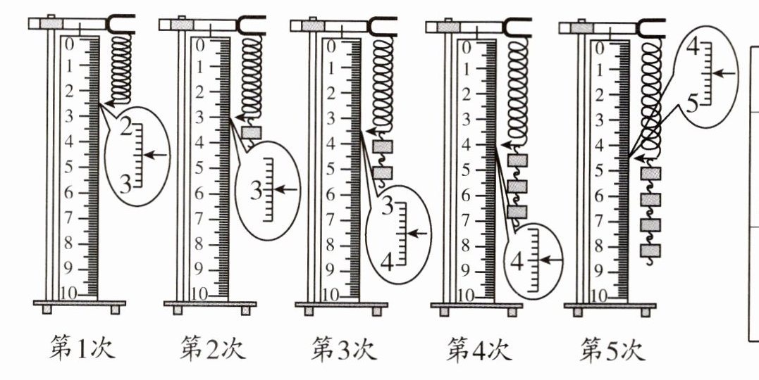 4. 某同学在研究轻质弹簧的长度与拉力变化的关系时,进行了如图所示的实验。已知每个钩码重为0.5 N,刻度尺的分度值是1 mm。