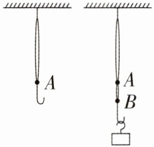5. 状状想制作一个简易弹簧测力计。他找来一根最大可以挂10 N重物的橡皮筋,先将橡皮筋上端固定在硬纸板上,下端挂上用曲别针作成的简易挂钩。静止时橡皮筋下端在A点处,再在挂钩上挂上重5 N的物体,静止时橡皮筋下端在B点处,如图所示。