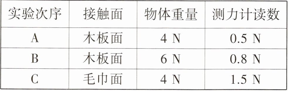| 实验次序 | 接触面 | 物体重量 | 测力计读数 |