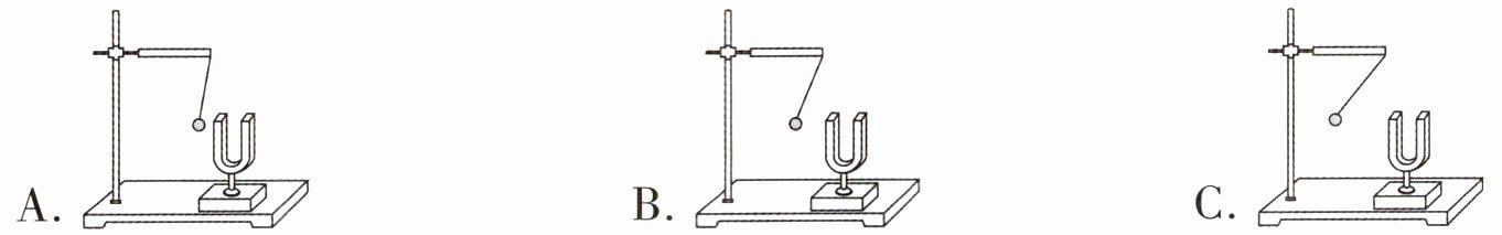 (4)同学们用选项中的装置研究影响声音变化的因素,三图都是小球离音叉最远时的情形。观察三个轻质小球被音叉弹开的幅度,我们能够判断,声音最弱的音叉是( )。