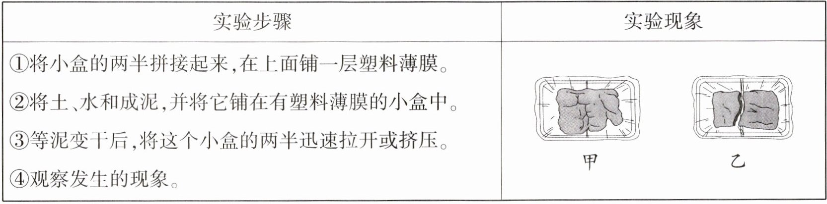|①将小盒的两半拼接起来,在上面铺一层塑料薄膜。②将土、水和成泥,并将它铺在有塑料薄膜的小盒中。③等泥变干后,将这个小盒的两半迅速拉开或挤压。④观察发生的现象。| |