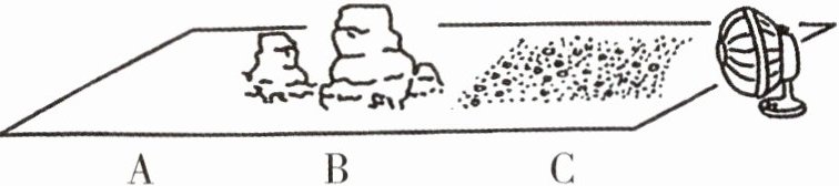 小科对于新疆魔鬼城的形成非常好奇,打算自己动手做模拟实验。他用沙子捏成了一块块“岩石”放置在B区域,“岩石”右侧的C区域铺上沙子和小石子,在沙子的右侧放了一台电风扇,调整角度吹向沙子和小石子。