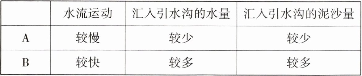 4. 用泥土堆成两个坡度约为30°的斜坡(如右图),在A坡种上草皮,B坡无草皮。用喷壶在相同的高度分别向两个坡面喷水,两个坡面的水流运动和水沟的汇水情况如表。