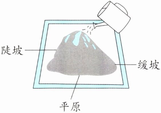 6. 如图是少年科学队对黄河流域研究的模拟装置,用喷壶洒水模拟的是______,在“山丘”顶部撒上带有颜色的细沙,是为了______。随着实验的进行,陡坡上的河道会发生的变化是______;缓坡区域会出现“平原”,说明产生了______(填“侵蚀”或“沉积”)现象。