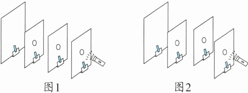 (4)由于光沿直线传播,小孔在一条直线上时,光线可以从所有小孔通过,在未打孔卡片上形成光斑;小孔不在一条直线上时,光线不能通过所有小孔,未打孔卡片上没有光斑。