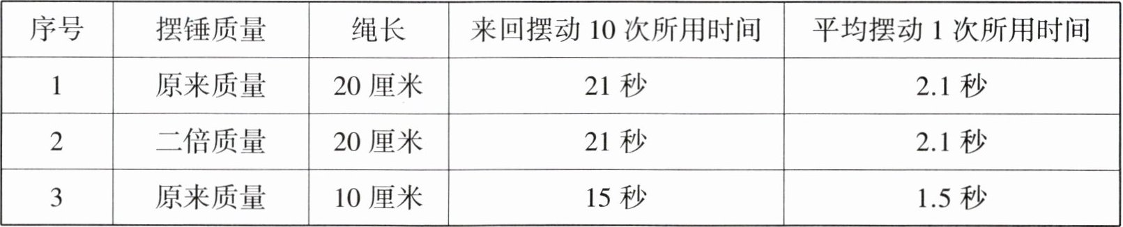 |序号|摆锤质量|绳长|来回摆动10次所用时间|平均摆动1次所用时间|