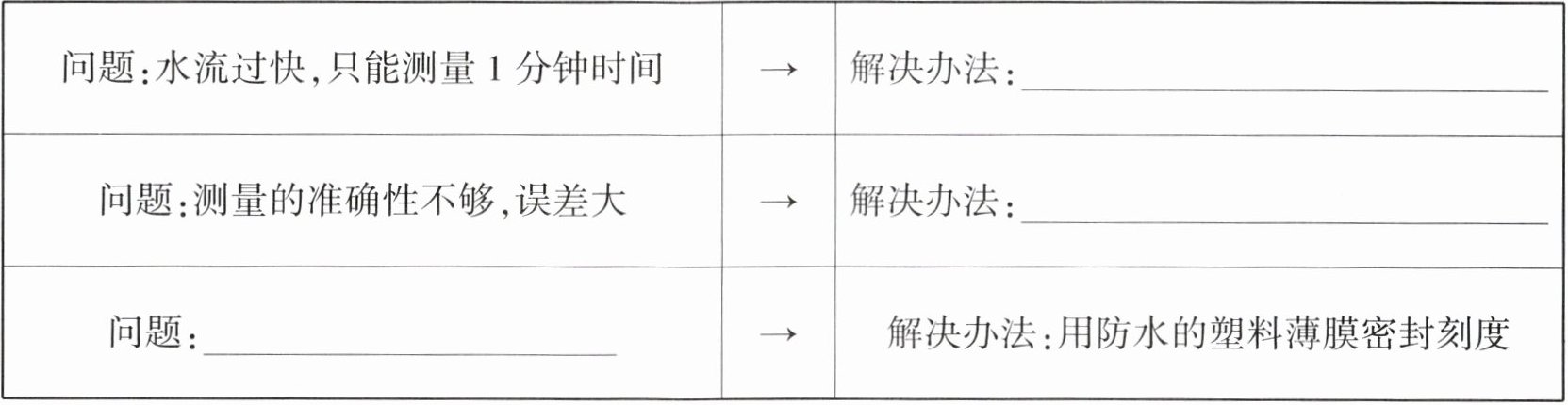 科学小组准备设计制作一个水钟,请帮忙完成以下"问题一解决办法"表格。